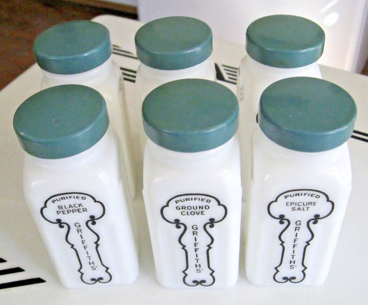 ANSWER: According to Griffiths, the value of the jars is largely historical relating to their time period, style, and the type of glass used (milk glass). Although a set with all of the original number of jars, original front and back labels and wood or plastic stand intact and in perfect condition has a greater historical/collectible value. Not to mention the purely sentimental value to all of us collectors. So, scraping off loose paint or sanding down to the bare metal and using a food safe sealer would not affect the value. Plus it would make them more sanitary for your use. Thanks for your questions. I will share them with other Griffiths collectors through the refurbishing guide.