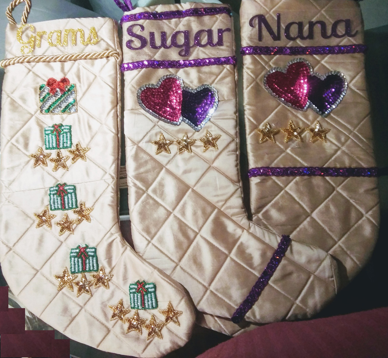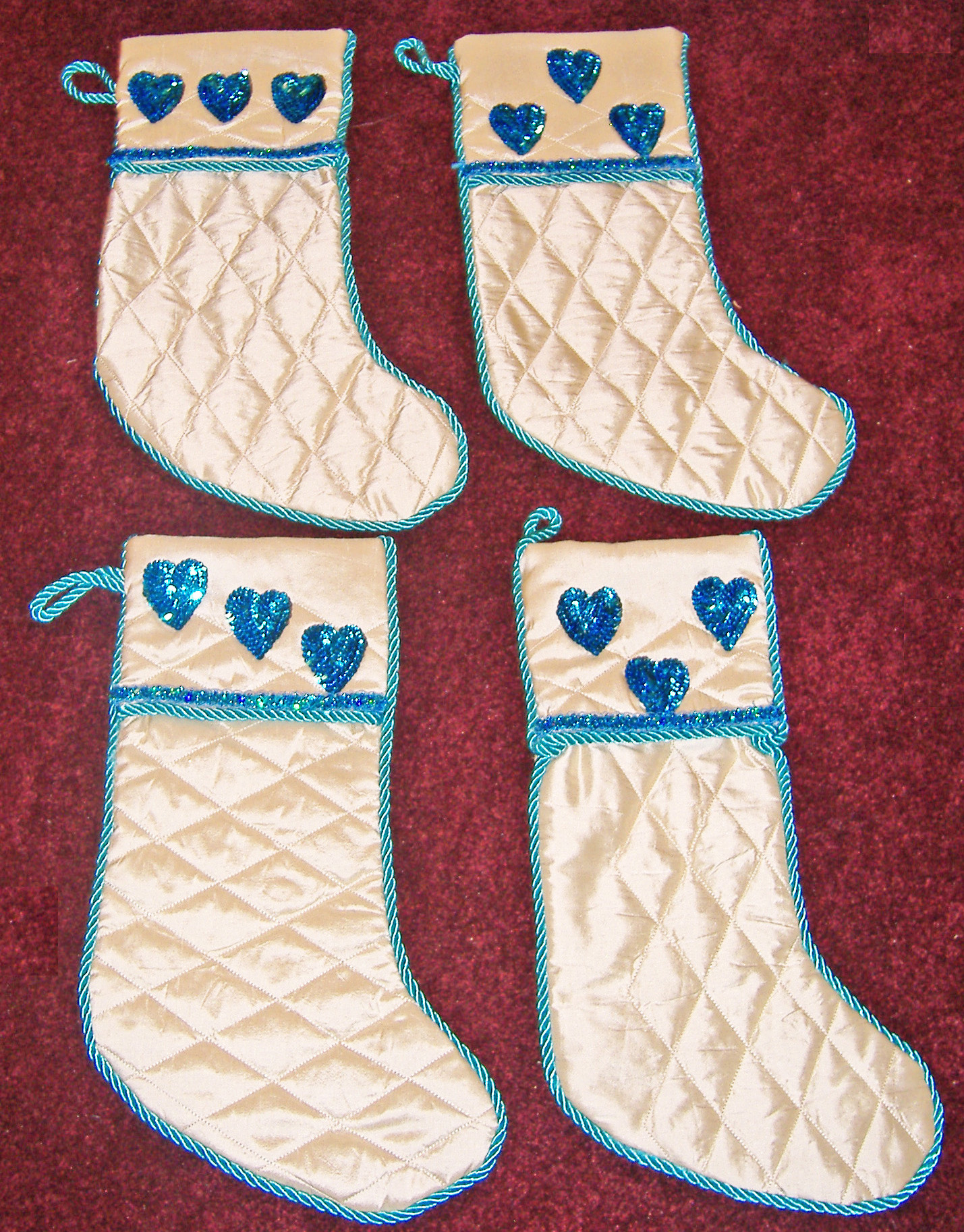 The stockings above, were made for a family with two grandmothers and a great-grandmother all of whom gather in one home for the Christmas holiday. The stocking for the great-grandmother has a gift box representing each of her children. The stars represent each of their children. For the grandmothers the stars represent the first generation of children. It would have taken too many stars to add all of the grand children. The colors were chosen to blend with the holiday decorating color scheme of the grandchild placing the order. I also made a tree skirt for her in the same quilted silk fabric.