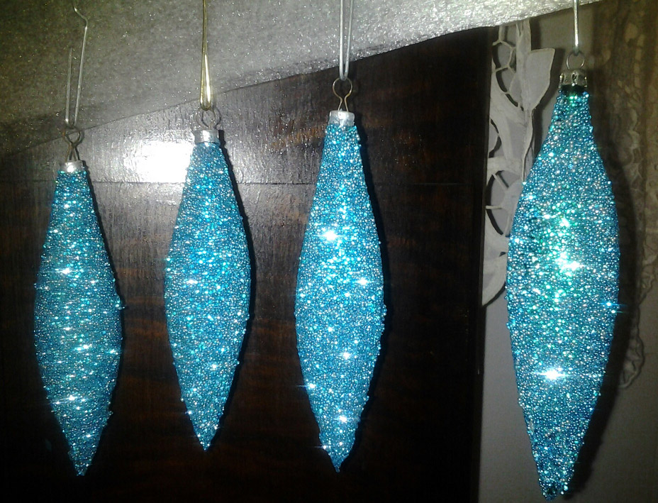 Remember to spray the glittered ornaments generously (on all sides) with one or more coats of a clear glossy spray to seal the glitter and allow them to dry an additional 24-48 hours before handling.
