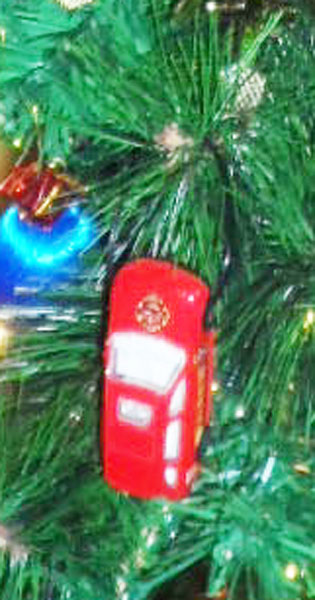 Several years in the hands of (now 2) little boys who refused to take it down, kept it lighted all year long, knocked it over a coupla/6 or 7 times and the tree was in desperate need of refurbishing. Some of the cars were gone, several ornaments were broken, lights not working, the topper was broken and askew. Ornaments they made in school were casually placed. Plus, I had given them a set of miniature, occupationally attired teddy bears to (hopefully ) encourage them to think about their future vocations.