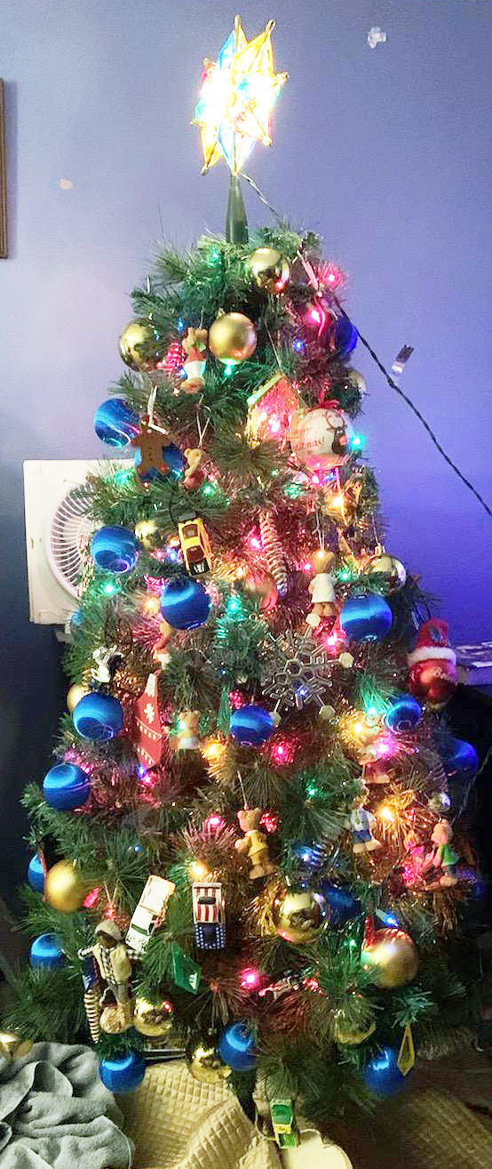 The blue and gold ornaments are 3” unbreakable Styrofoam. Clear cord and green twist ties were used to secure all of the ornaments and the light strands so that if he accidentally knocked it over nothing would fall off. Light strands set back near the center of the tree so that they were not near the cars, ornaments or where he could touch them. I added a brass Nativity with a hole in the bottom so that a bulb from the tree could be inserted and illuminate the baby Jesus. I want him always to remember that Christmas is about celebrating the birth of Jesus Christ and He should never be forgotten.
