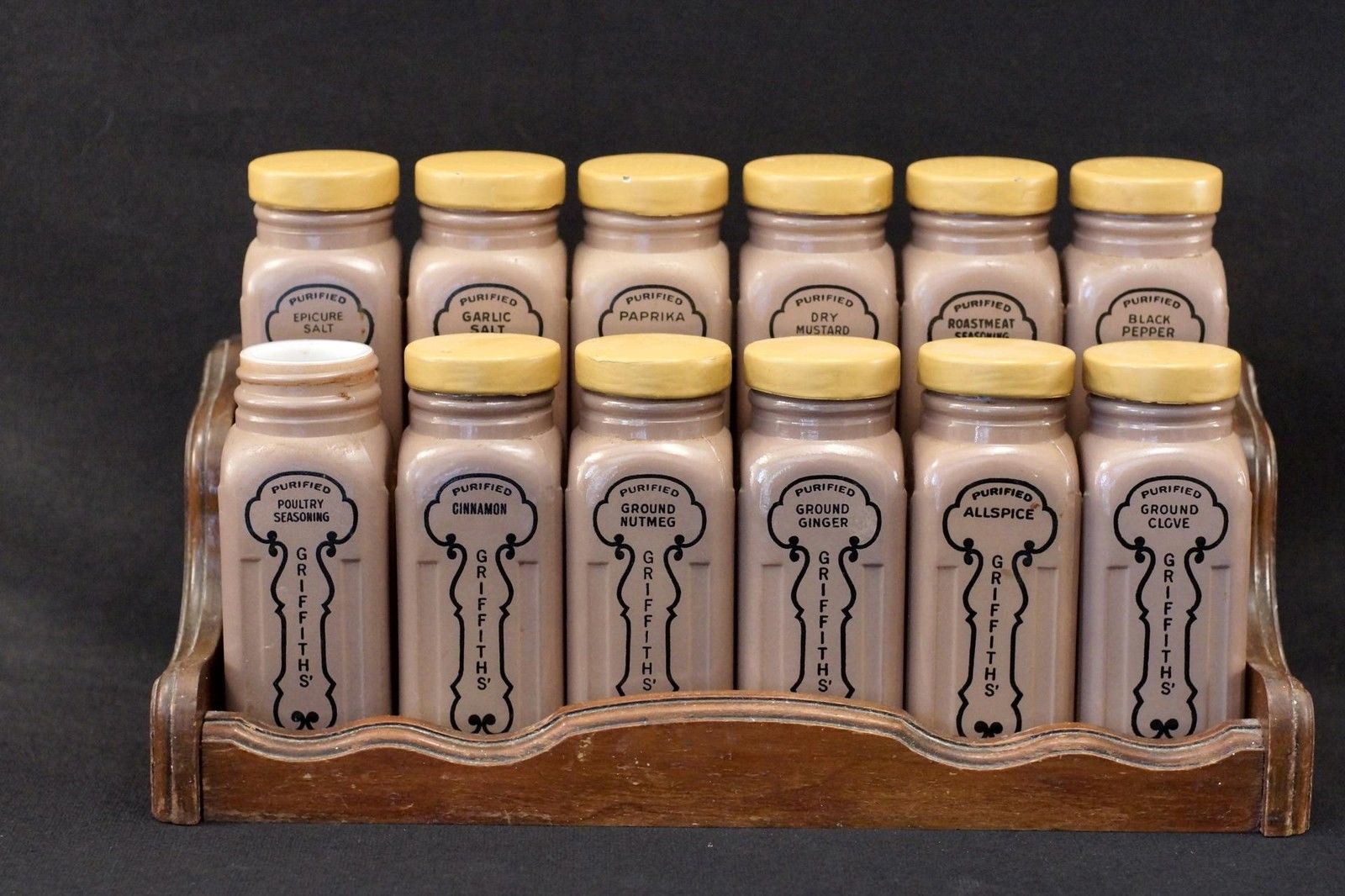 Only jars with the labels missing or partially torn off are fair game for refurbishing. Please, please do not refurbish or destroy a complete set of Griffith Spice Jars that are in perfect original condition with the original labels intact, the shaker inserts, metal lids and /or original spice rack! Intact original sets should be left untouched - used, appreciated and loved for their historical and collectible value.