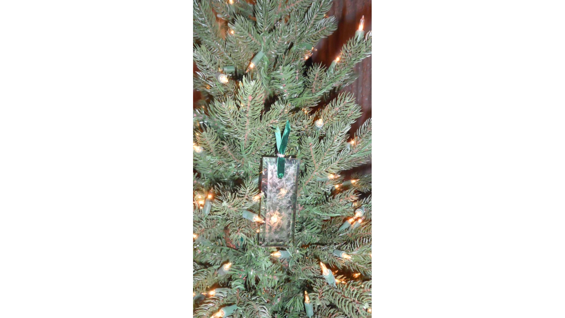 I've added an Aurora Borealis jeweled spacer bead at the top of the ornament to stabilize the ribbon and catch more light from your tree. The dark green velvet hanging ribbon will blend into your green tree and won't add a different color to your tree or other glass Christmas ornaments. If you place them in front of a light on the tree, the pattern will show through more clearly. Thinking about using them on a snowball/white/flocked Christmas tree? Let me know before placing your order and I will check into using white velvet ribbon instead of the green.