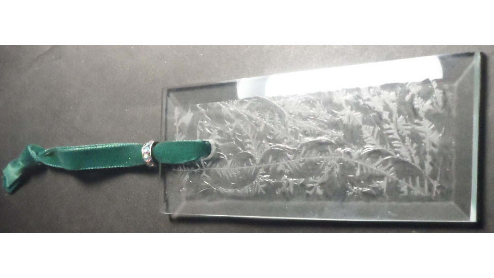 that is until I saw them. A beautiful fern-like frosted glass pattern is etched onto a clear background. I call these long, flat crystals "Wintergreen" because they remind me of winter frost on a window. Not immediately discernible in the photos, there are three or four slightly different patterns. The overall effect is of delicate fronds covered with snow. The patterned front has texture and is raised; the edges of each flat glass Christmas ornament are clear and beveled about 1/8" all the way around. The back is clear glass and completely flat. You can hang the ornament either way - beveled edge out or flat edge out. Not being a professional photog, the beauty of these ornaments was a bit difficult to capture. But, I tried. :-)