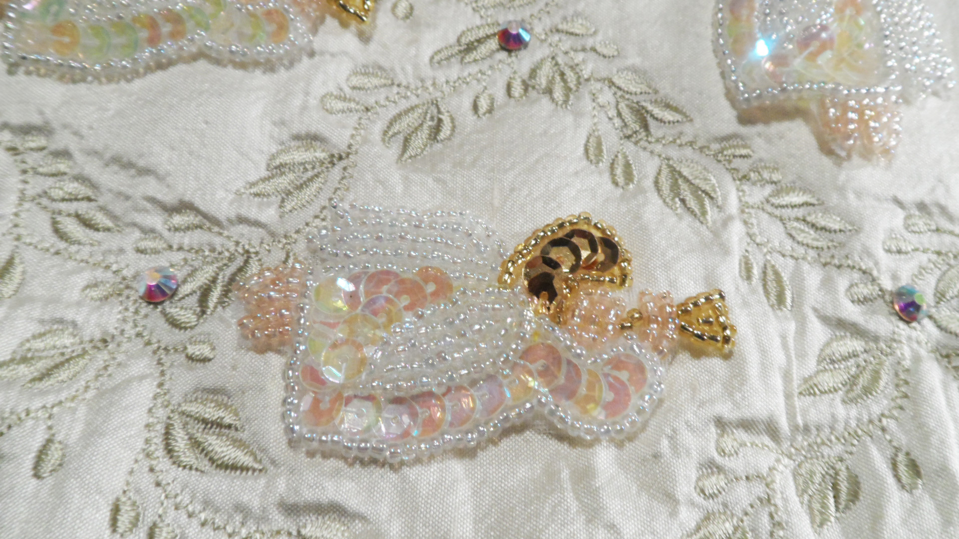 Angels played a prominent role in the Christmas story announcing the conception and birth of our Saviour. If you love angels, this is the perfect holiday themed tree skirt for you! You get one 6" silver trimmed, gold and cream angel centered in the design flanked by sets of left and right facing miniature 2" angels on the front of the custom made silk Christmas tree skirt. This elegantly embroidered taffeta fabric is edged with shiny cream twisted rope trim. The laurel leaf accent outlining the diamond shapes is a silvery pale green thread with a bit of sheen. Aurora Borealis rhinestones are sprinkled in the design area between the miniature angels.